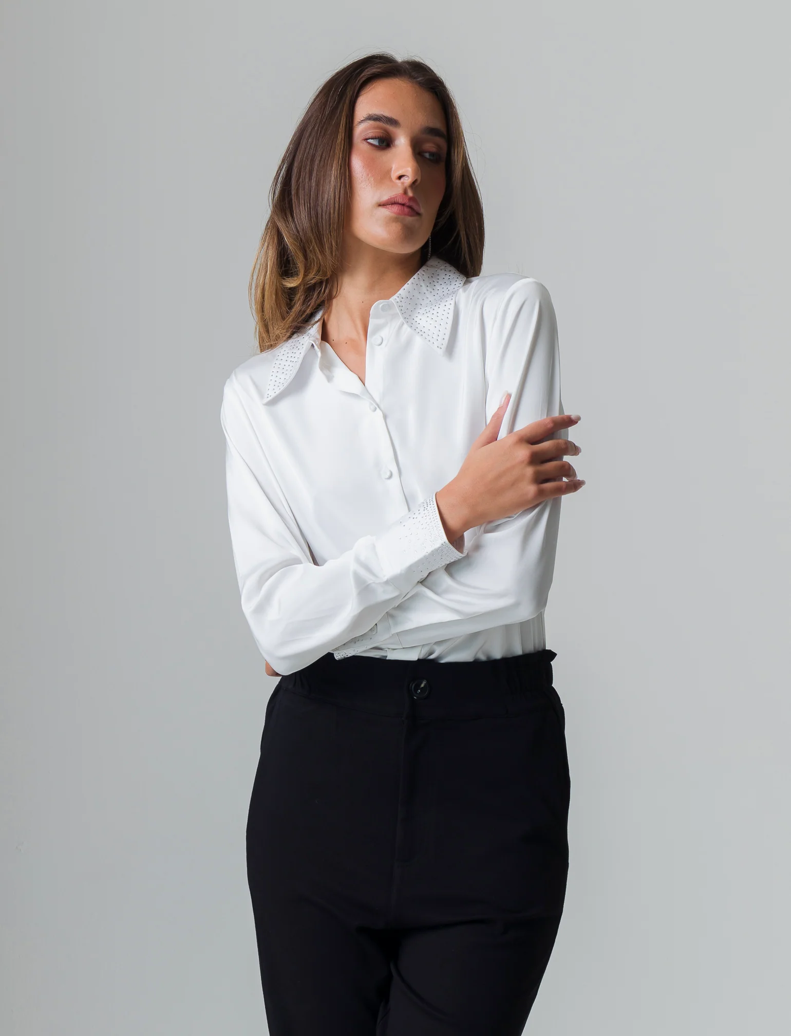 Elegante camicia manica lunga in satin, pensata per la donna moderna. Caratterizzata da raffinati dettagli con applicazioni di strass sul collo e sui polsi, questa camicia unisce stile e comfort. La vestibilità comoda consente di indossarla in diverse occasioni, dal lavoro a eventi informali, aggiungendo un tocco di glamour a qualsiasi outfit. Perfetta per esaltare la femminilità, questa camicia rappresenta un elemento essenziale nel guardaroba, capace di trasformare anche il look più semplice in una dichiarazione di stile. Il prodotto è di colore Bianco panna