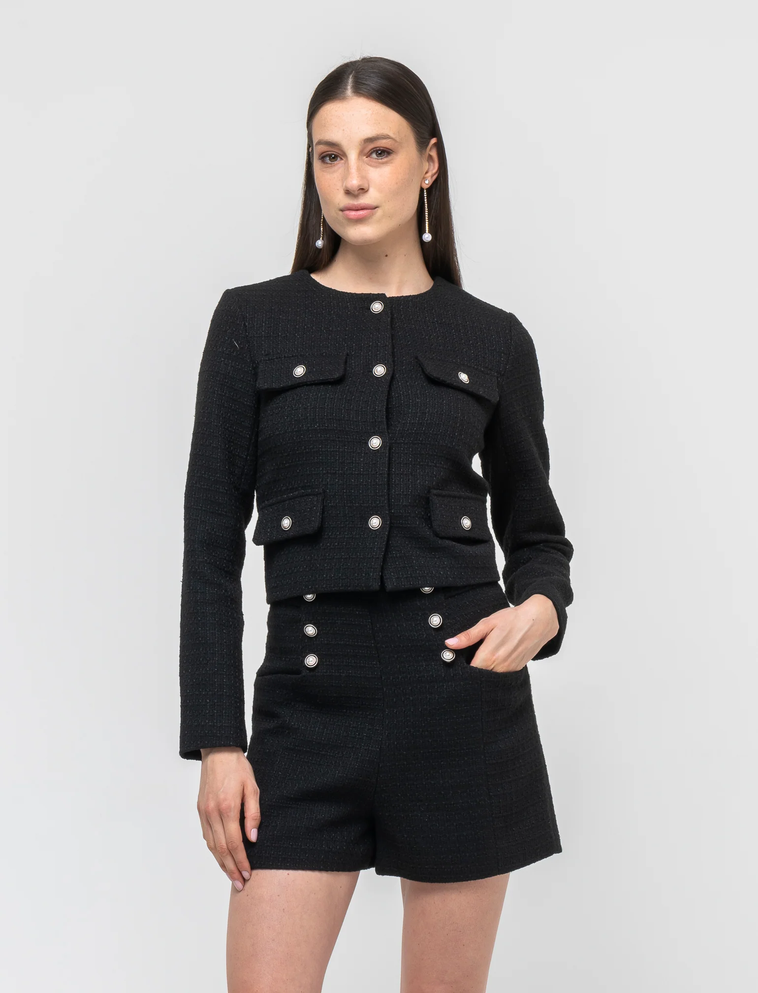 La giacca girocollo con bottoni gioiello è un capo d'abbigliamento elegante e versatile, ideale per la donna moderna. Caratterizzata da un design raffinato, si adatta perfettamente a diverse occasioni, dal lavoro a eventi serali. I bottoni gioiello aggiungono un tocco di luce e originalità, rendendo ogni outfit unico. Realizzata con materiali morbidi e confortevoli, offre una vestibilità impeccabile, valorizzando la silhouette femminile con stile. Il prodotto è di colore Nero