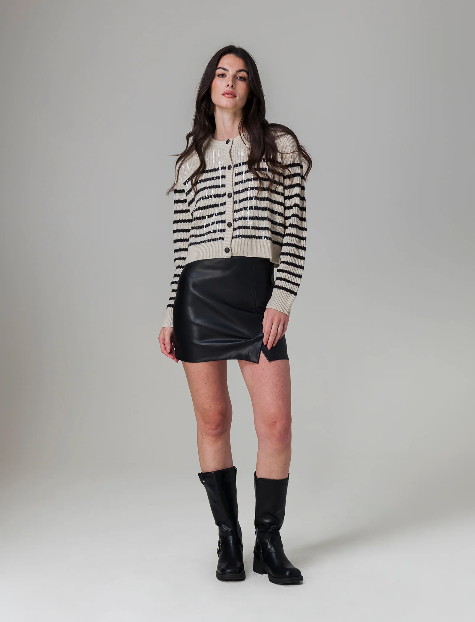 Minigonna in similpelle, caratterizzata da un design corto e dritto che esalta la silhouette femminile. La chiusura con zip laterale aggiunge un tocco di praticità e stile, rendendo questo capo versatile per ogni occasione. Perfetta da abbinare a top eleganti o casual, è ideale per chi desidera esprimere la propria personalità con un pizzico di audacia. Un must-have nel guardaroba di ogni donna moderna. Il prodotto è di colore Nero
